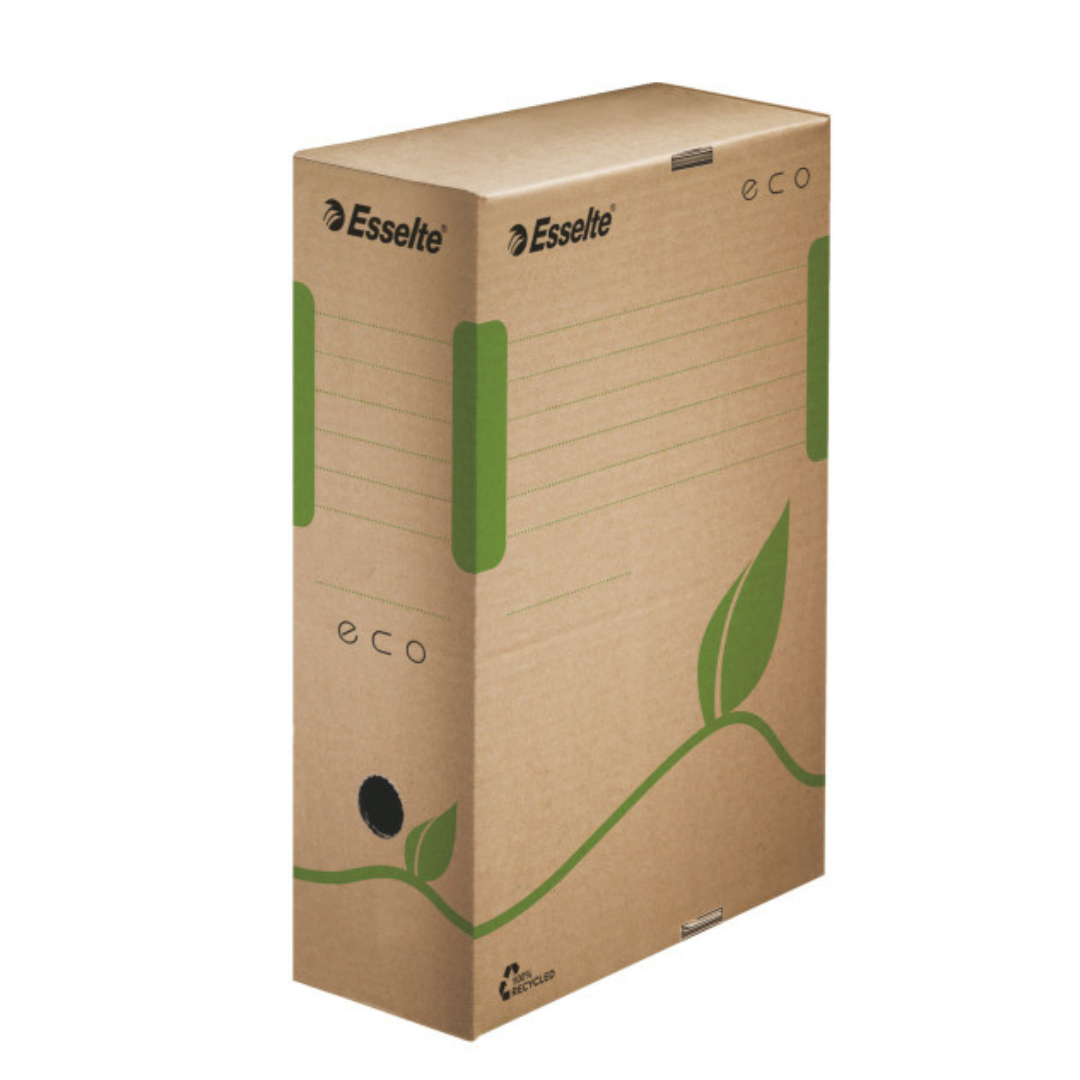 Karton archiwizacyjny Esselte 80 mm z certyfikatem FSC to praktyczne i ekologiczne rozwiązanie do przechowywania dokumentów wyjętych z segregatorów. Sprawdzi się w biurze oraz domowej przestrzeni do organizacji papierów. Produkt wykonany jest w 100% z kartonu pochodzącego z recyklingu.
