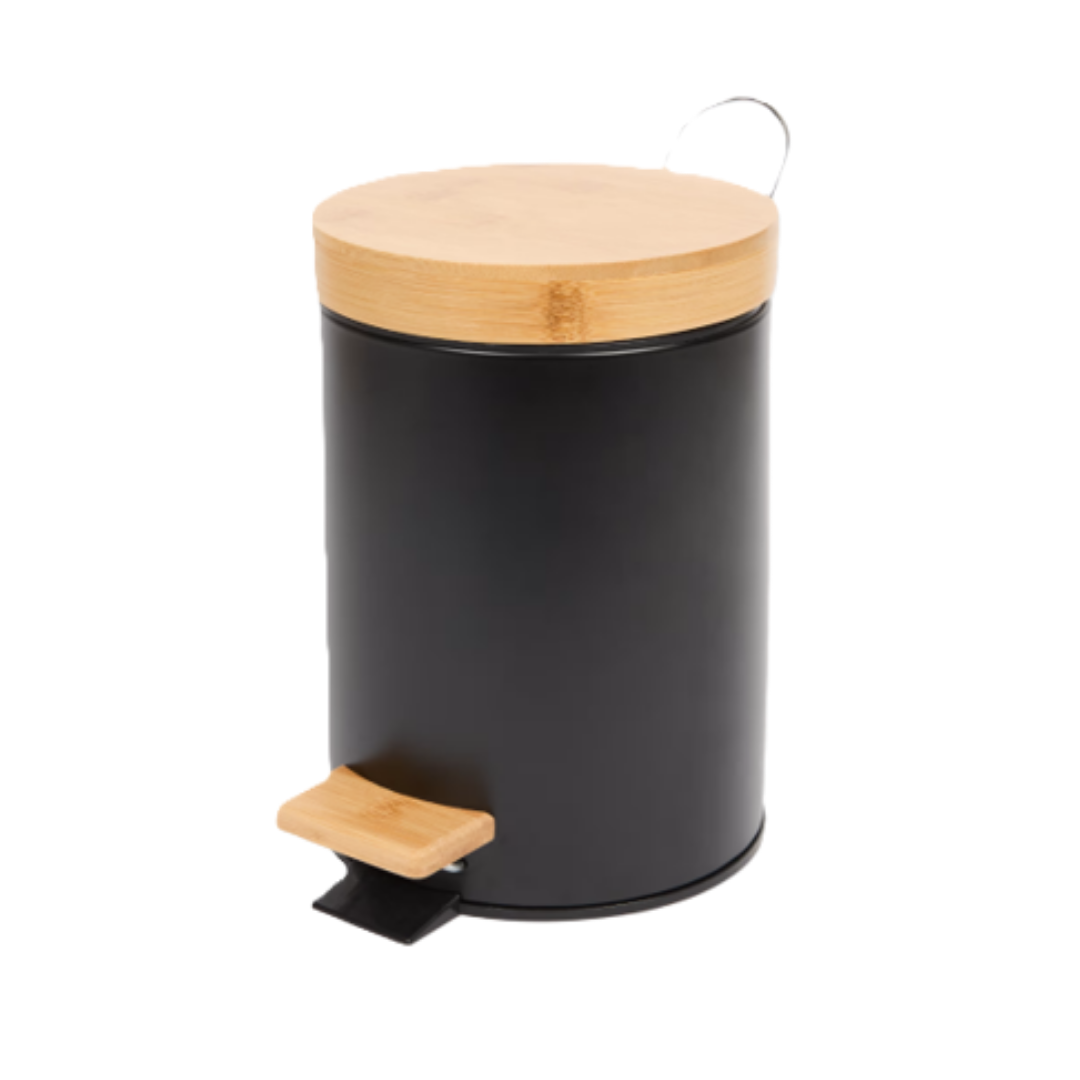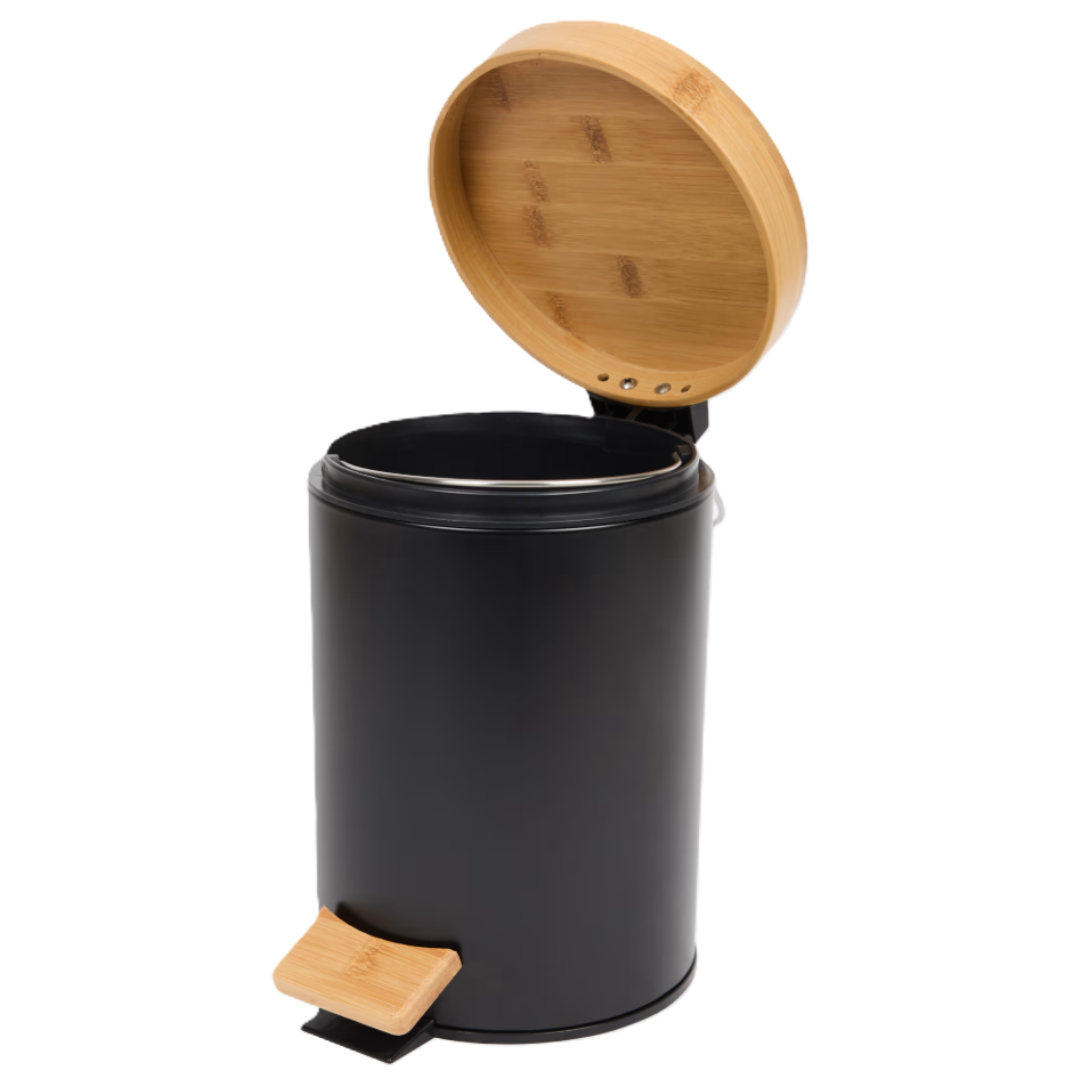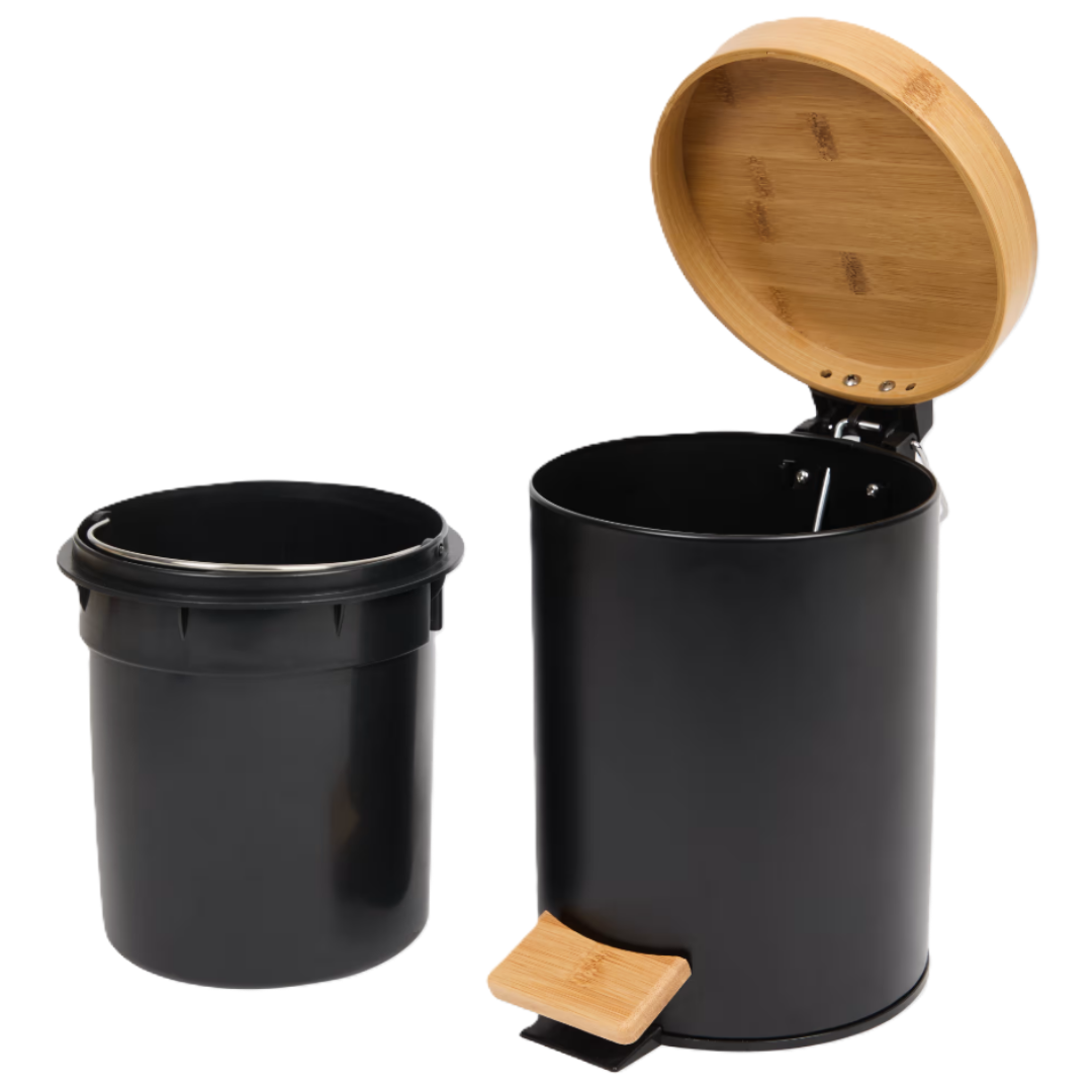 - Materiał: bambus FSC (pokrywa, pedał) + metal + tworzywo sztuczne (pojemnik wewnętrzny)